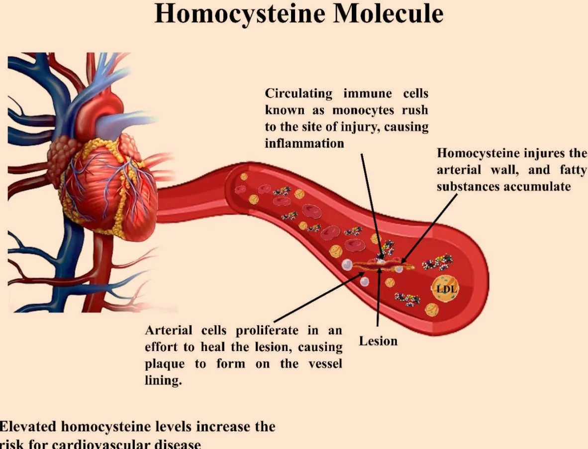 High levels of homocysteine commonly referred to as hyperhomocysteinemia has long been established as a risk factor for ischemic heart disease, heart attack, sudden cardiac death, premature coronary artery disease, carotid artery stenosis (narrowing), blot clots, stroke, and peripheral vascular disease.